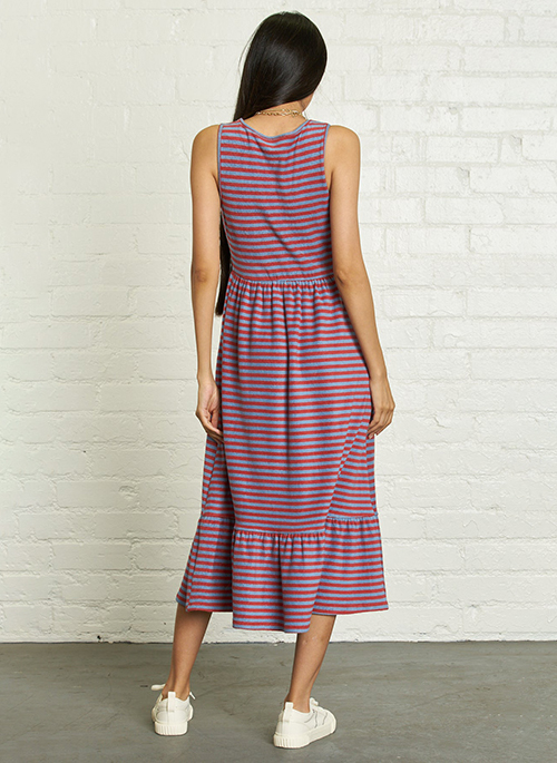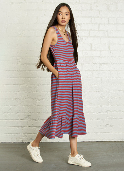 Cut in a Red and Blue striped knit knit, the Beau Dress.