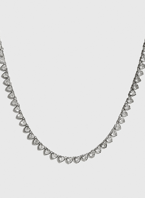 The rise of the heart jewels is rising. The beautiful bezel heart shaped tennis necklace is a revised twist to your timeless classic tennis necklace. This elevated item can be paired with any casual outfit and any party dress.