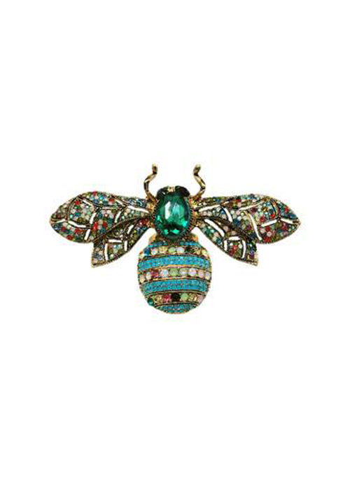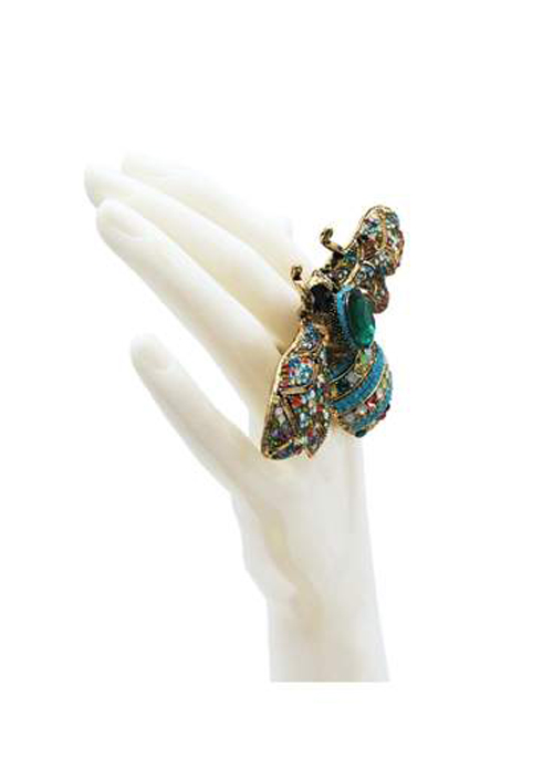 This oversized one-of-a-kind Fab Bee Ring is the ultimate on-trend statement making addition you need in your jewelry box this season. The jet black eyes, green crystal head and striped pave' incrusted body compliment the striking multi colored crystal embellished art-deco inspired wings. The back is filigree style, making it lightweight and easy to wear. This goddess style cocktail ring will demand countless compliments- it's like an effortless piece of art decorating your hand and outfit!