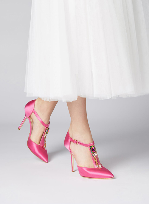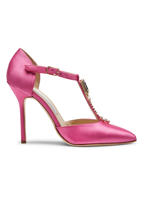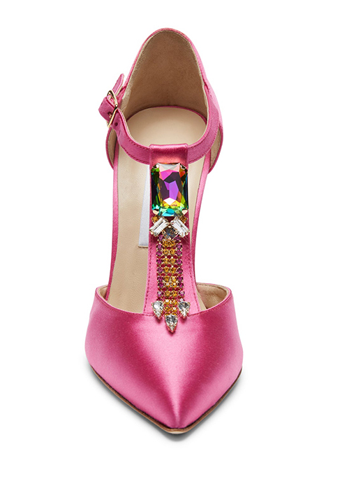 One word: showstopper! That's how we'd best describe these t-strap pumps. Meticulously handmade jewels embellishing the vamp feature a crystal that reflects light in rainbow colors. Their pointed toe silhouette is timeless. These magenta high heels are the crowning detail to your ensemble. Perfect for cocktail hour, a formal events, or a night out.