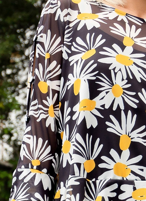 Everything is coming up daisies in this 3/4 length sleeve top. Perfect for those who want a bit more coverage but still want to remain cool during the warmer weather! Lightweight stretch mesh has a barely-there feel. Side slit detail down the sleeve with matching buttons and a flounced hem. Comes with detachable cami lining.Details: