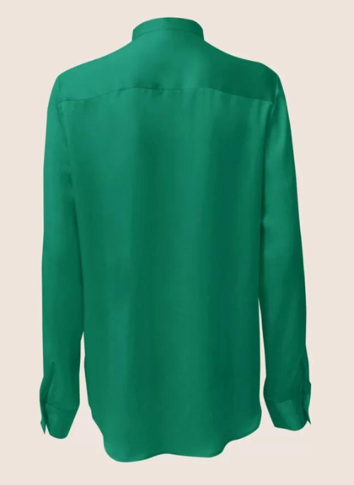 Green silk limited edition tuxedo shirt with mandarin collar and shot. The closure is front with hidden buttoning. Featuring visible laminated fabric buttons to the collar and cuffs. Head designed and made entirely in Italy.