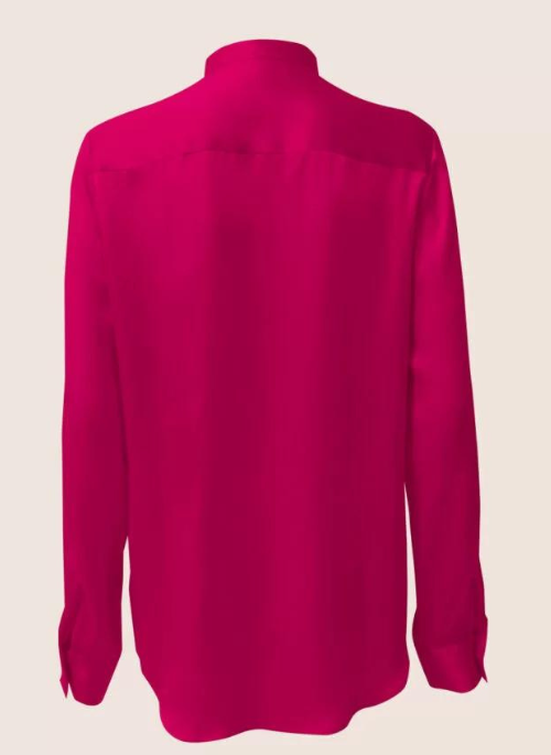Fuchsia silk limited edition tuxedo shirt with mandarin collar and shot. The closure is front with hidden buttoning. Featuring visible laminated fabric buttons to the collar and cuffs. Head designed and made entirely in Italy.