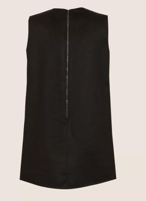 Black A-line wool suit. The minidress is characterized by the panel with overlapping rouches on the front and enriched by the sartorial application of tone-on-tone faceted stones.