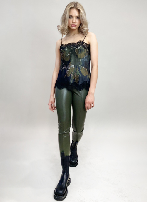 Silk cropped cami with a straight neckline in our Beverly Hills Garden Print. This camisole has adjustable straps, lace at the neckline and hem, and two small slits on the side seams.