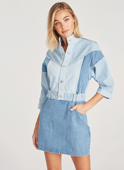 Mid Sleeve Denim Mini Dress with Color Block Denim Pattern in Light Wash.Details: 100% Cotton