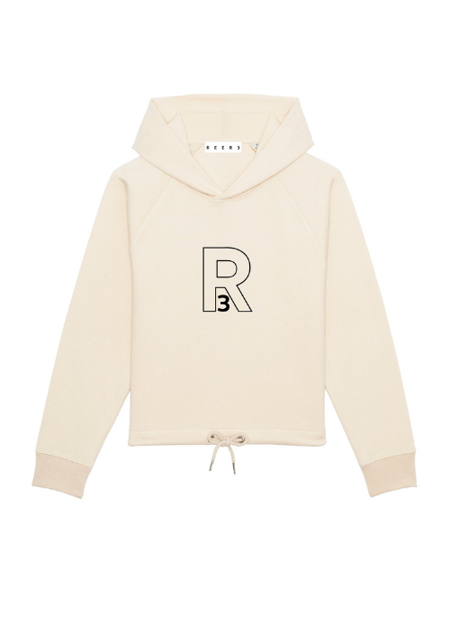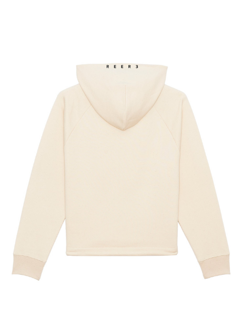 Short women's hoodie in natural GOTS certified organic cotton. Wonderfully light and soft quality. Even after many washes, the softness remains. Fairly produced for a clear conscience. A real feel-good piece that delights with a fitted hood and a drawstring with a cord in the same color at the hem. With motif print.