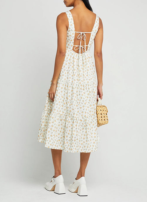 This fresh summer dress has a classic tiered skirt but takes it up a notch with its open back detail. Finished with delicate ties and done in a cotton linen blend.