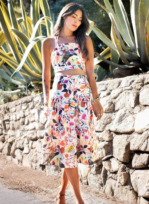 Why blend in when you can stand out? Exquisite details and colorful bird print fabric is one of our favorites so we had to make it into a matching set! Flattering silhouette with an open back cropped top is perfectly balanced with a full midi skirt. The pebbled crepe is cool and soft to the touch and adds dimension to this piece of artwork.