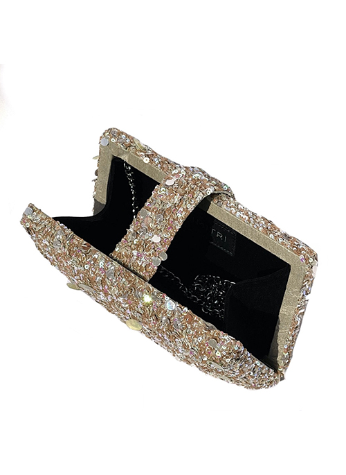 - Multi shaped beige sequins hand embroidered clutch with a magnetic belt flap as closure