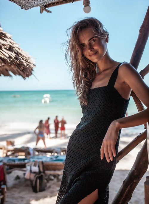 Our bestselling Blake dress is back and in black for the first time ever. The silhouette is similar to our Kira mini, but the longer length adds a sophisticated, cocktail-ready vibe. The fully lined silhouette is handcrafted from soft cotton that's carefully crocheted to create lattice-like circle cutouts. The shape drapes beautifully and the pretty grosgrain straps lay flat against your shoulders. The deep side split is the super sexy cherry on top.