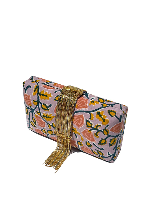 - Lilac & orange colored cruelty free silk clutch with hanging gold tassels on the front and back flap