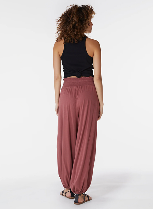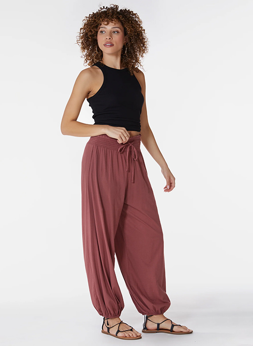 Style and comfort at a whole new level with our new boho pant! Balloon leg pant with a ruffle paper bag smocked waist, and adjustable drawstring! Pair these pants with your favorite bobi tee.