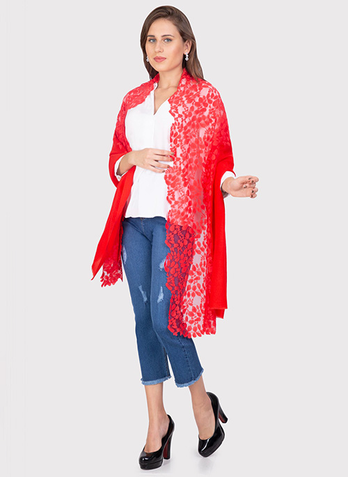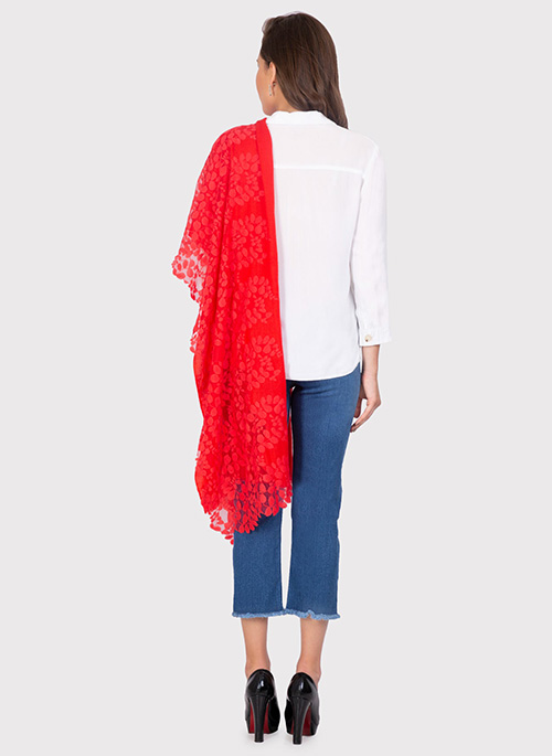 Crafted from a very comfortable and light blend of linen and modal, this wispy dark ruby scarf is emboldened with a substantial tonal dark ruby leaf patterned lace giving it a distinctive yet utterly feminine look. A gorgeous accessory to any day time wear.
