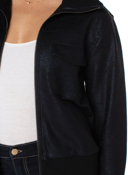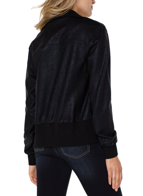 This unique coated bomber jacket is super comfortable and easy to wear! Pair this jacket with denim and sneakers for a casual get-up around town or pair with a legging and slip on some heels for a night out!
