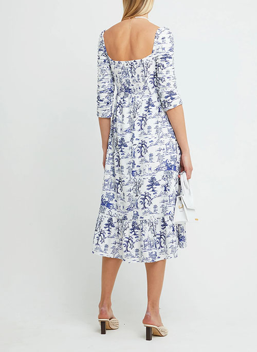 Simple and elegant, this dress features a square neckline, ruched sleeves, and a single tiered skirt.