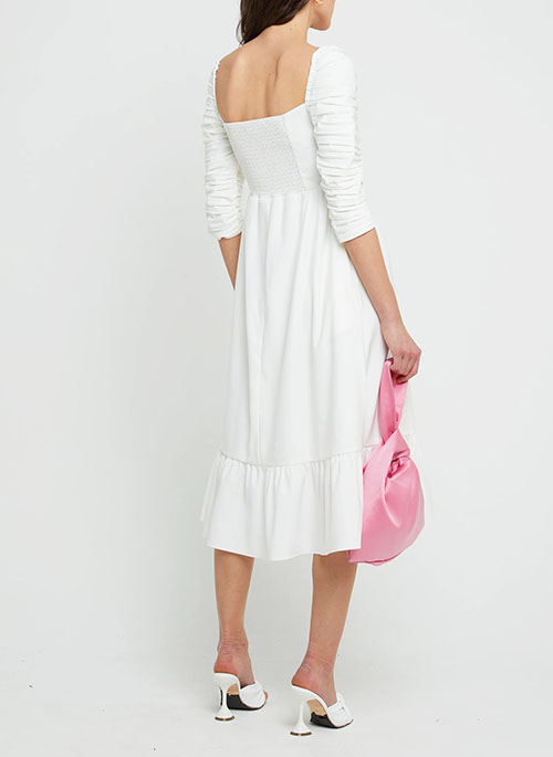 Simple and elegant, this dress features a square neckline, ruched sleeves, and a single tiered skirt.