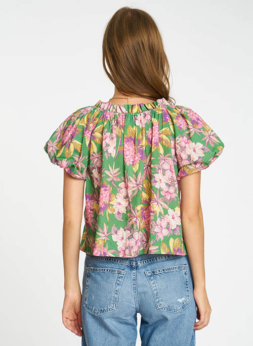 This balloon sleeve Bonnie Top is outfitted in a Green and Pink tropical floral print fabrication. An adjustable ruffle neckline and puff short sleeves give the boxy top a delicate feminine finish. It’s that subtle pop of pattern that adds dimension to any look.