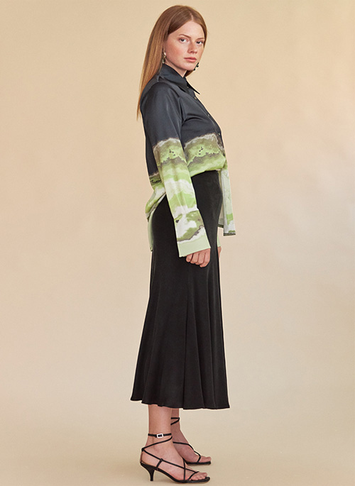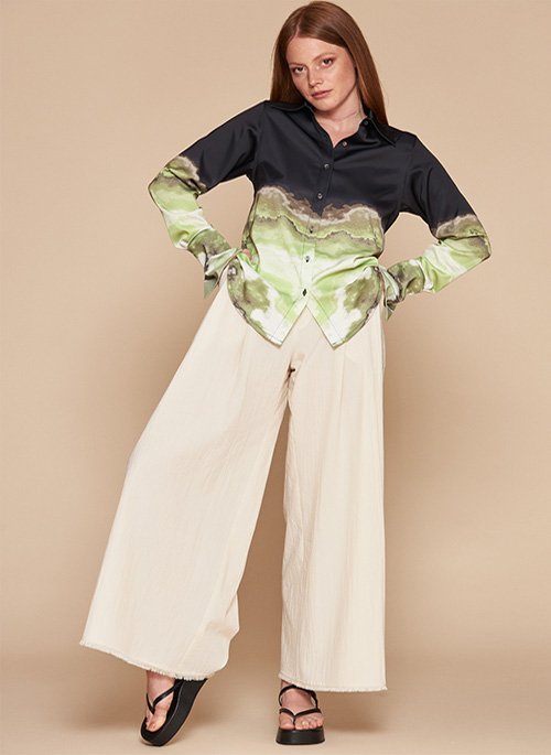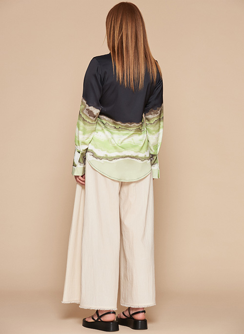 Our rPET shirt is as modern as a timeless shirt can be, is cut from recycled PET fabric with GOTS certified digital print, detailing small seashell buttons, large cuffs and classical lines.