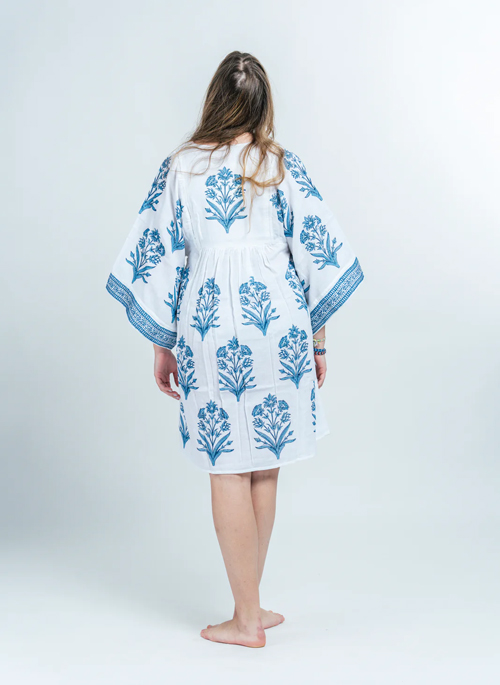 Soft slightly sheer cotton block printed with our latest design, a romantic detailed flower with a touch of India. The dress is generous and fits many shapes. It has a V neck yoke top trimmed with hand embroidered detail, drop shoulder with butterfly sleeves. We’ve also added pockets. Perfect for lounging around the house, walking around town, and fits comfortably in one’s suitcase as you venture off to some sunny location.