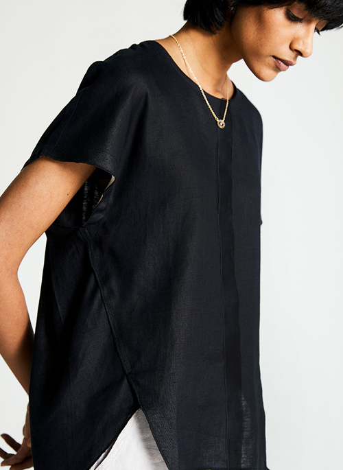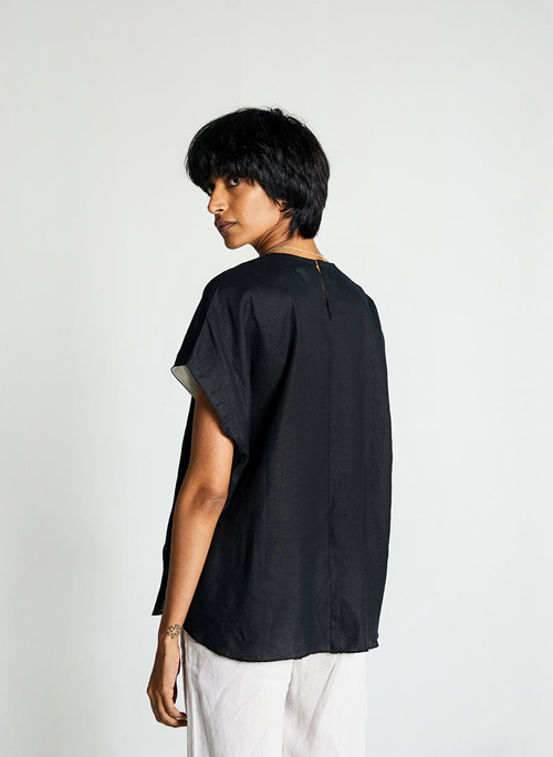 A structured, kimono style shirt, we love the wide sleeve and off-white hemp detail. This is an elegant, simple piece you can grab and wear everyday.