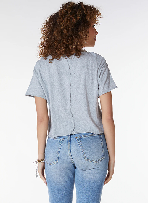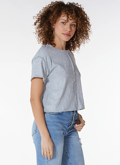 Created to be comfy and cool, this cropped, boxy tee has a ribbed neckband, raw edge and overlock details at the sleeve, hem, and center seams. Pairs perfect with your favorite denim.