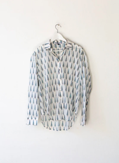 Hand printed soft cotton material which has a smooth touch but is also crisp and cool tailored into a not too serious blouse with shell buttons. It’s a nice easy to wear garment made from material that will only get better with use. The material has been hand block printed in a delicate Indian floral prints. The flower is predominantly various shades of green with a touch of yellow.