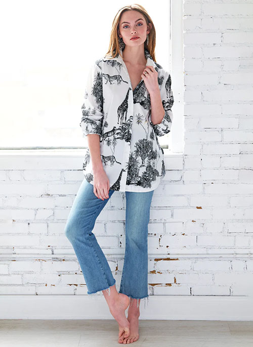 - Long sleeve, faced shirt-tale hem, hidden front button placket