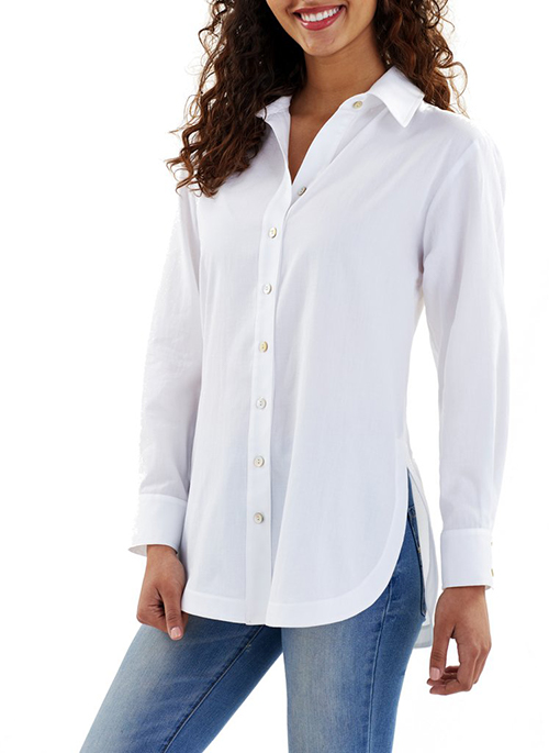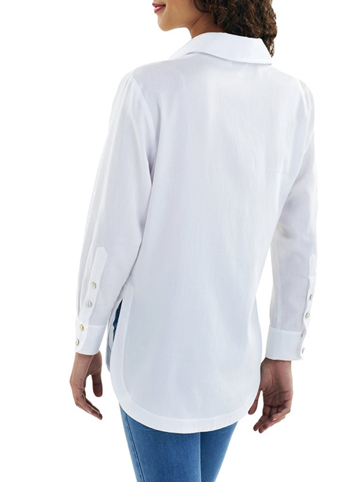 - Long sleeve with extended sleeve placket, faced shirt-tale hem