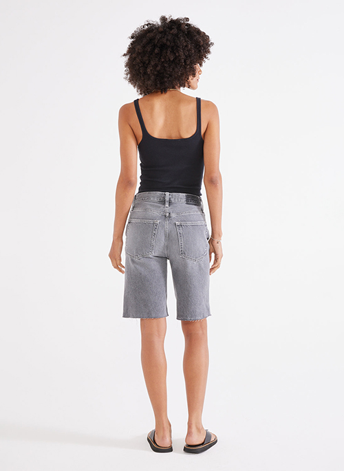 A chic short in an authentic vintage grey wash with subtle abrasion. Fit is easy, sitting comfortably at the waist, with a straight leg finishing just above the knee.