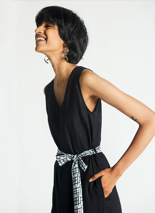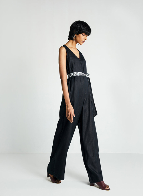 With a modern V-neck, this flattering wide-leg jumpsuit with a tie-up sash is a chic and comfortable on-trend wardrobe must-have.