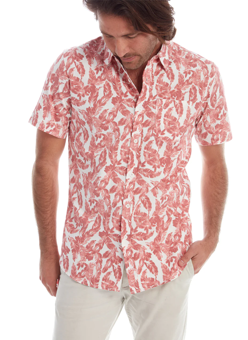 Short sleeve cotton slub floral button-down shirt with all-over print.