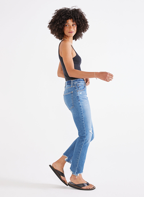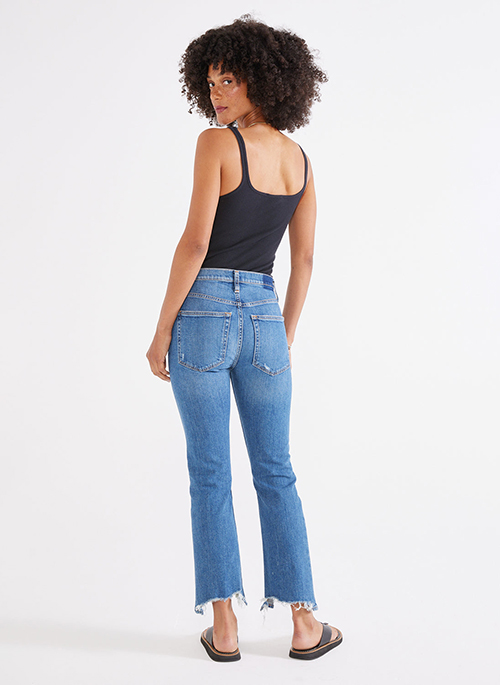 An easy fit with a classic rise, Brigitte is cropped above the ankle with a frayed step-hem. This soft, organic comfort stretch denim is finished with authentic destroy.