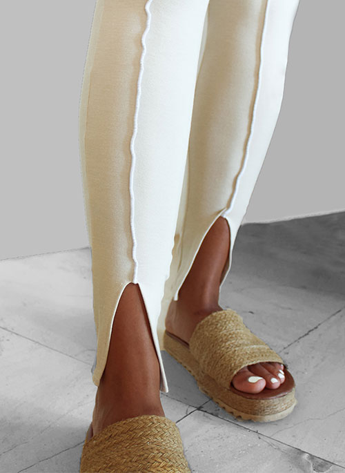 Fitted high-waist knit pant with a 2 1/2" extra tall folded waistband. Featuring white exposed front/back leg seaming and a front split hem detail on a contouring double knit fabric in a neutral cream color. Pair with the Brigitte crop top to complete the set!