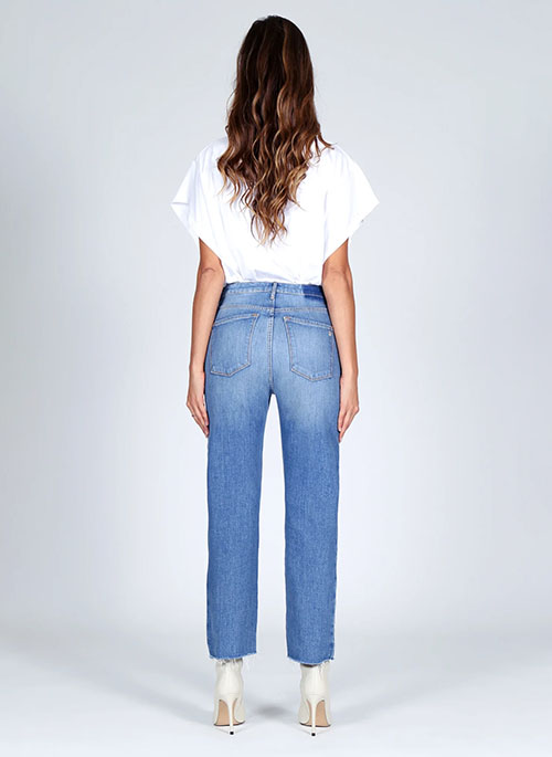 These jeans will have you jumping around for joy. A totally on-trend straight frayed boyfriend jean. This medium vintage wash has subtle whiskering at the thighs and the perfect amount of hand sanding down the front.