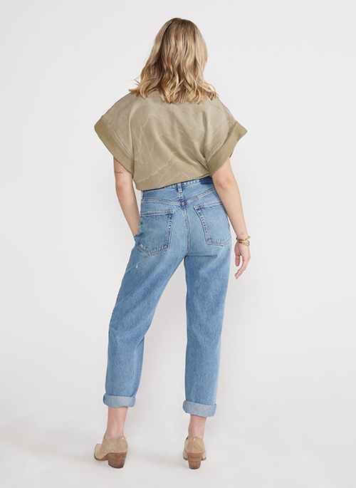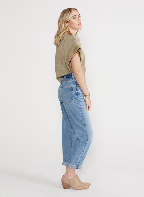 An 80’s throwback that sits at the true waist and eases through the thigh and leg. The inseam finishes in the perfect spot for a roll or a slight stack.