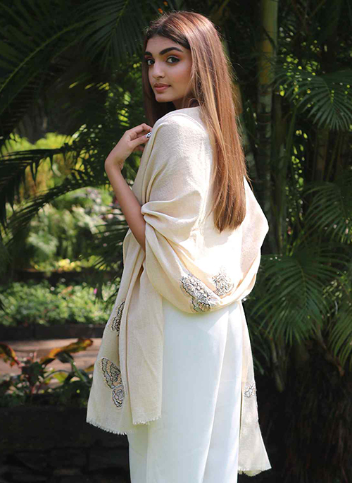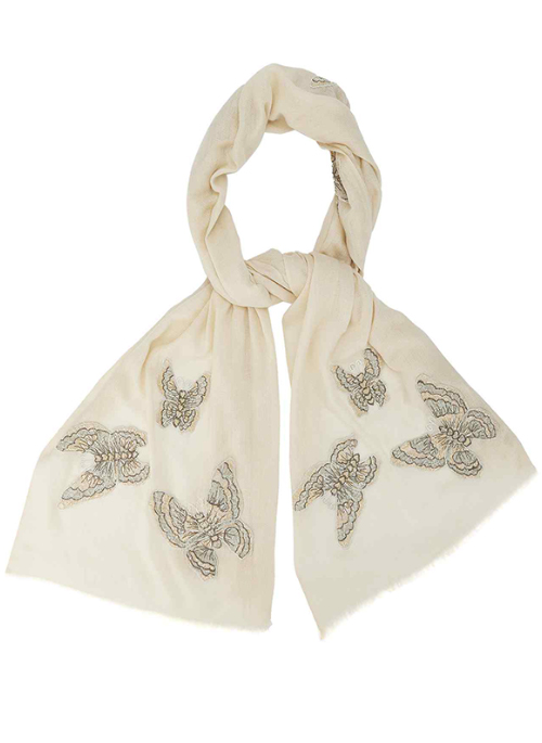 A stylish scarf made from fine cashmere designed with unique butterfly lace appliques.