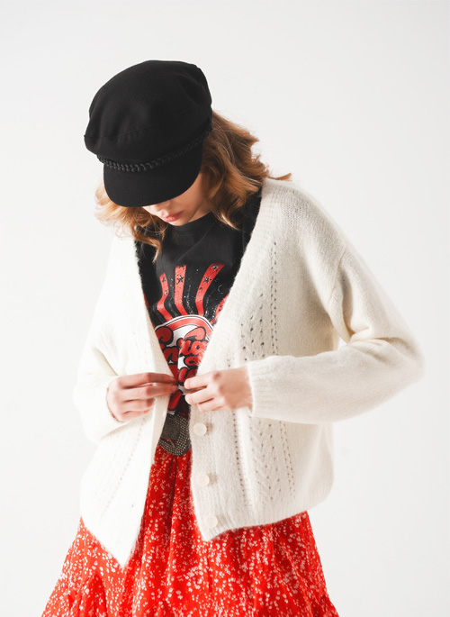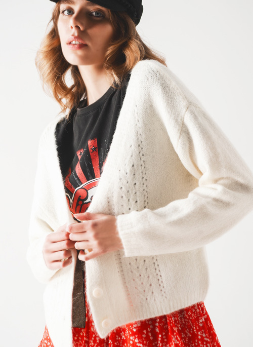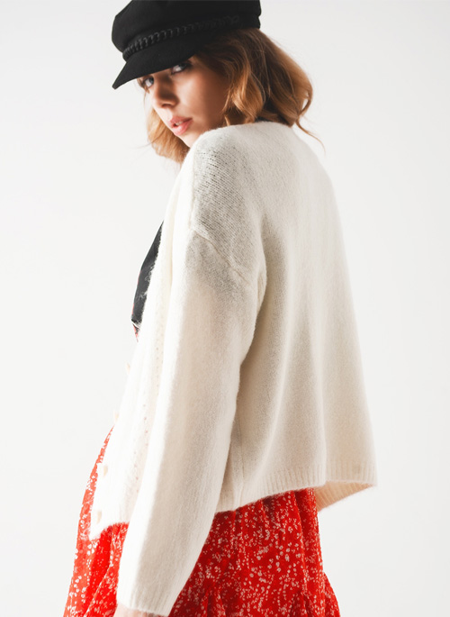 NEW BUTTON DOWN CARDIGAN IN CREAM Details: 56% Acrylic 40% Polyamide 4% Elastane. Model is wearing size S. Model is: 33-23-35 Height: 5'10''. Runs true to size. Relaxed Fit. Style Nº: 1281106.
