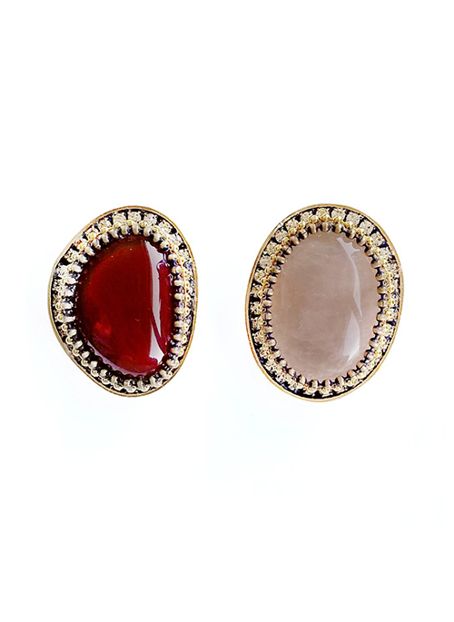 Our Byzantine Earring And Necklace Set is funky and fashionable. The necklace features an array of colorful beads and semi-precious stones, including rose quartz, jade, and carnelian. The large stones in each of the three gold-plated shapes are surrounded by Swarovski pearls and clear baguette Swarovski crystals. The clip-on earrings have a comfortable sponge backing, and feature smaller stones in carnelian and rose quartz. They are adorned in a similar fashion to the necklace, with smaller Swarovski crystals and pearls.