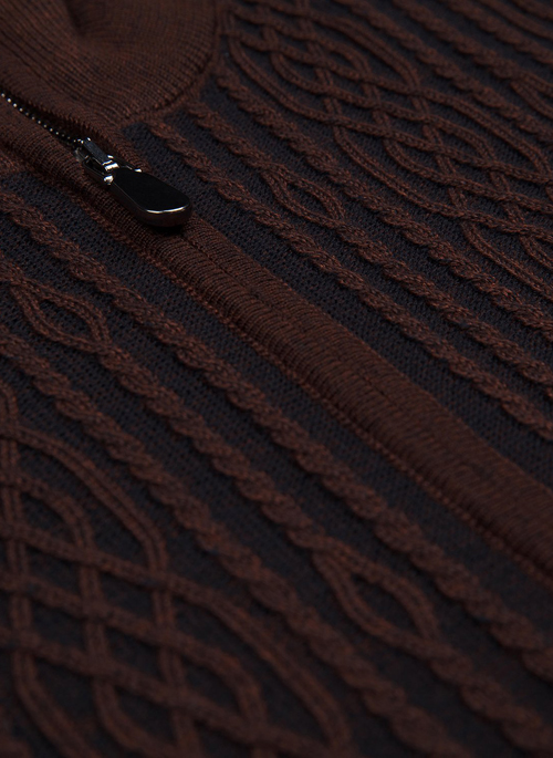 Long sleeve full zip mock neck sweater in 100% Merino wool with cable knit in the fron and solid sleeves and back, rib knit neck, cuffs and waistband.