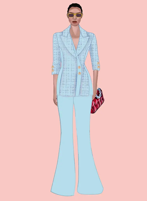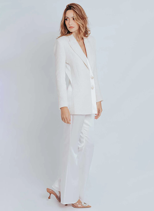 Double breasted tweed blazer with satin details features gold-tone embossed buttons and a relaxed fit. Our signature button detailing on cuffs along with an exaggerated low neckline make the perfect combination for this classic yet modern look. The flare cut from the pants makes it easy to style and comfortable to wear.