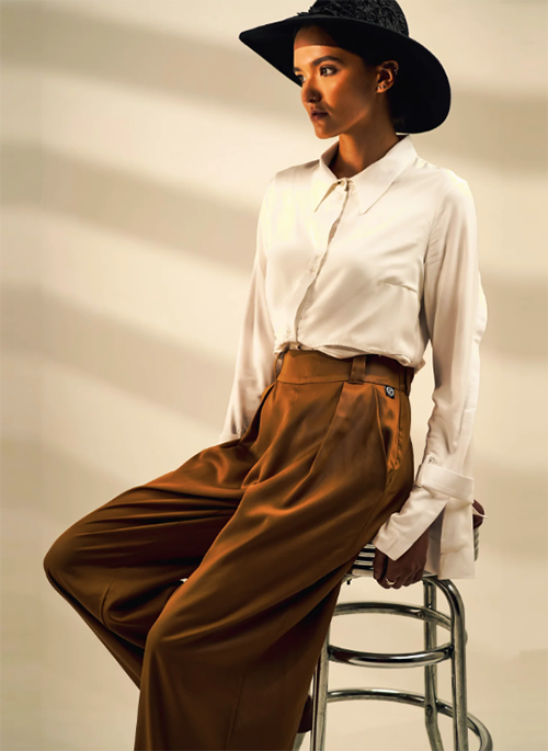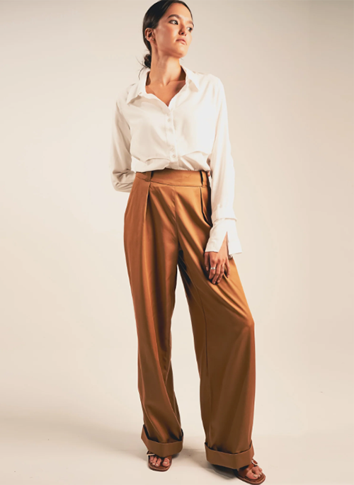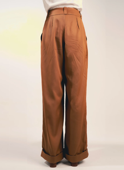 This statement Camel Trouser is tailored to sit high on the waist and drape to a wide leg with front pleats for an elongated effect. Hand crafted in a high quality Tencel. The fibres are certified as compostable and biodegradable, and thus can fully revert back to nature.