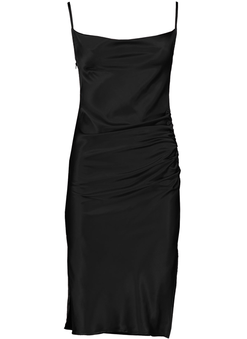 An effortless midi slip dress cut from a lustrous satin with cowl neck, thin adjustable straps, and delicate ruching at the side for a flattering fit. Perfect for the social events on your calendar or date nights and night out with the girls.