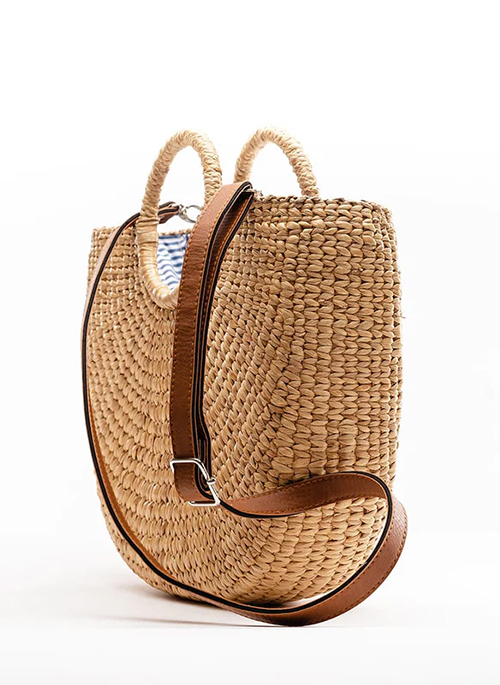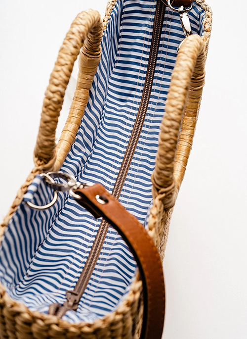 The Camryn Costal Tote Bag is a perfect seagrass beach bag with a detachable and adjustable crossbody strap. Inside is our coastal lining in a deep-sea blue and white.
