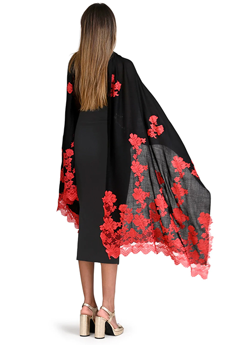 Woven from a very fine cashmere, this beige scarf features an intricately handcrafted application of an exotic contrasting gold Chantilly lace extending inward in a vine pattern from the ends of the scarf. A stunning evening wear accessory whist keeping you fashionably warm.