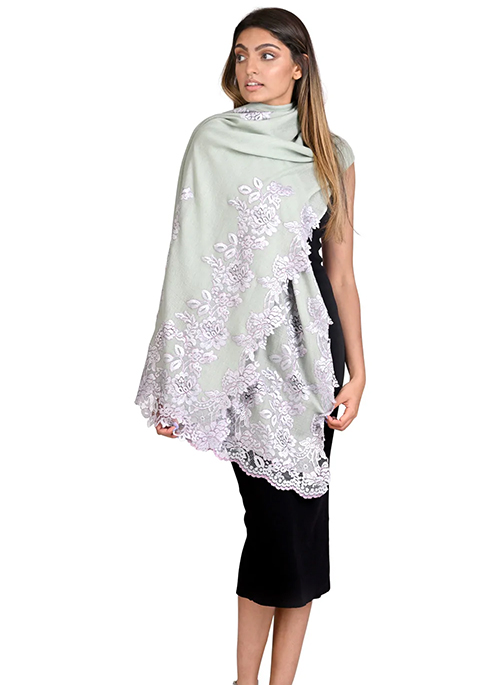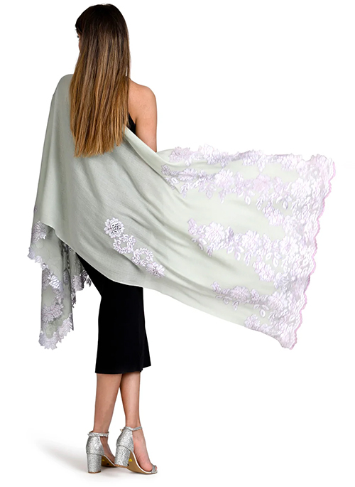 Woven from a very fine cashmere, this light sage green scarf features an intricately handcrafted application of an exotic contrasting light blue and violet Chantilly lace extending inward in a vine pattern from the ends of the scarf. A stunning evening wear accessory whist keeping you fashionably warm.
