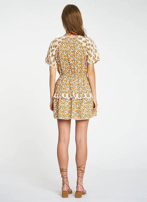 Airy and classic with buoyant details, the Carmella dress features embroidered front bib design and a tiered skirt. Outfitted in a Yellow Block floral print and finished off with adjustable rope ties with tassel and ladder lace inserts, this dress gives off a soft and youthful look