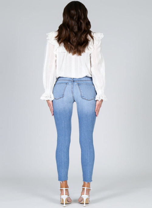 Don't you wish I was yours? A high-rise skinny, that features a zipper fly and an ankle-length raw frayed hem. Don't you Wish is a light blue wash with light whiskering throughout the jean.