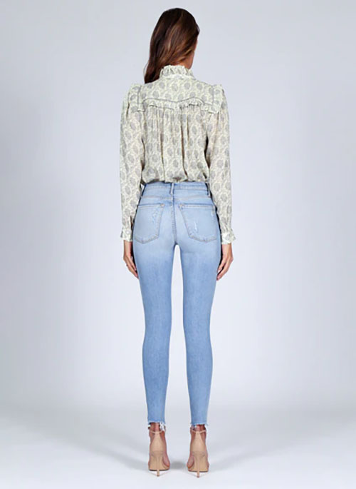 Never ever seen a jean like these. A high-rise ankle-length cropped skinny with a zipper fly and a raw frayed hem. Cut from our Liquify fabric to ensure the jean sculpts and contours to your body, Someday Never is a light blue wash featuring distressing at the knees and pockets.