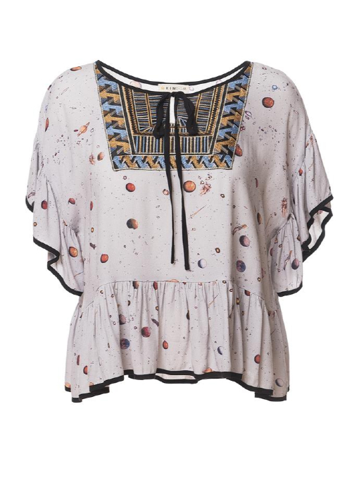 Space is the place to be! Say it with our Carolina ruffle-sleeve top in reclaimed rayon crepe, printed with our Cosmic Universe print. If you look closely, there's a little astronaut floating among the planets, moons, and stars. It's a conversational print embellished with an embroidered yoke. Be unconventional, be the universe!